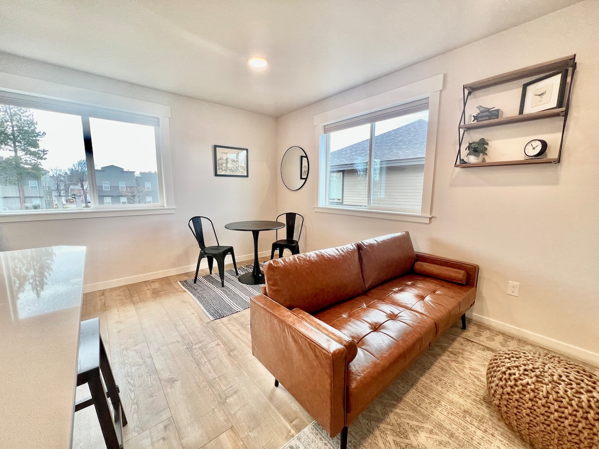Este elegante estudio en el corazón de Sunriver está recién remodelado con una cama tamaño king. ¡Piscina de temporada y jacuzzi durante todo el año! A poca distancia a pie de un nuevo lote de camiones de comida con 7 camiones, asientos interiores y exteriores y un bar. Wifi rápido, una nueva televisión Samsung de 50pulgadas iniciada en Netflix, Hulu, HBO Max y más. A 25 minutos del monte Soltero. A 25 minutos del centro de Bend. El estacionamiento está a solo unos metros de tu puerta. Este condominio súper limpio es perfecto para todas tus aventuras en el centro de Oregón.