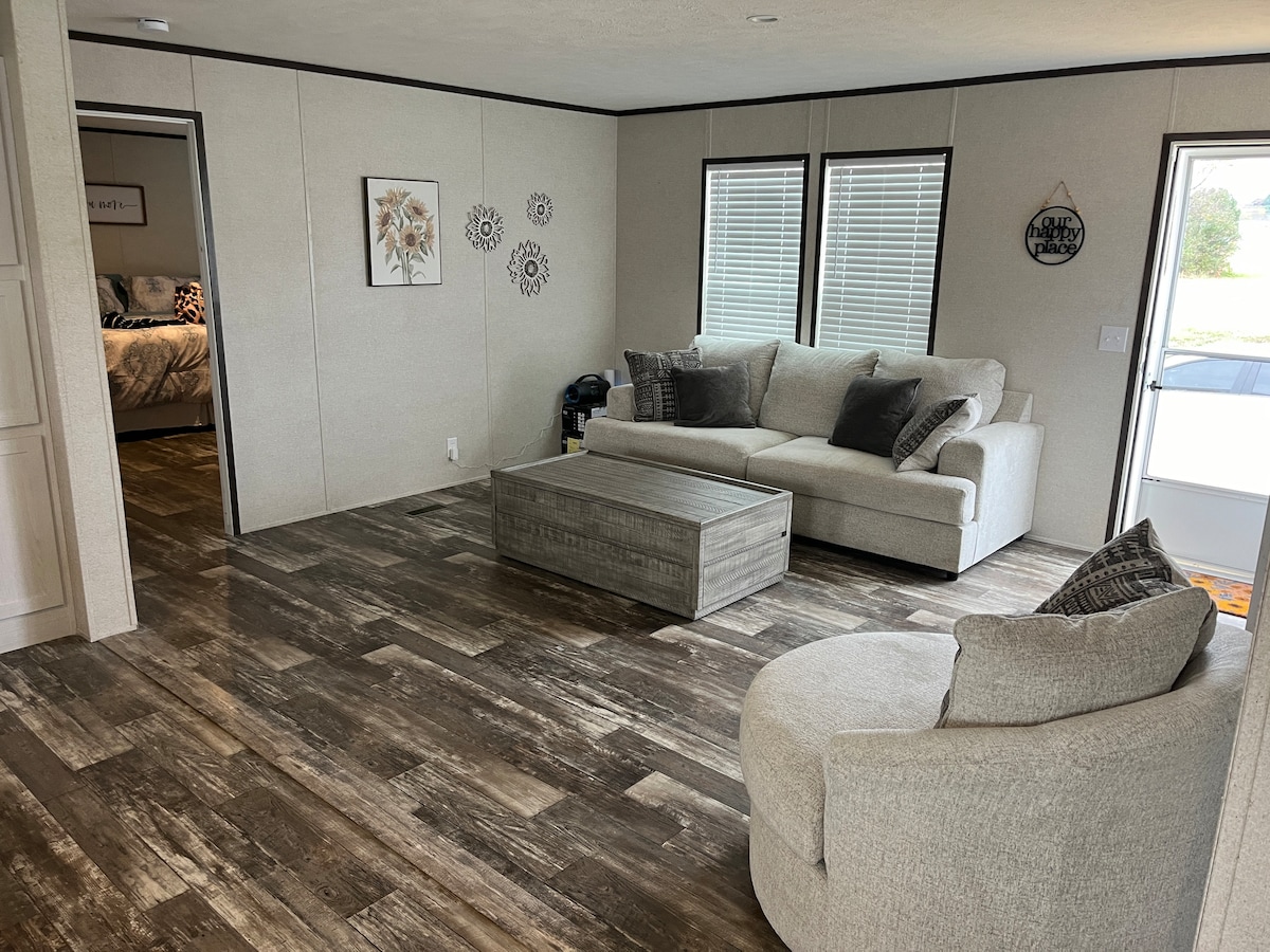 Casa nueva de 1455 pies cuadrados en Checotah, OK, a solo 1 milla del lago Eufaula y Belle Starr Marina. Capacidad para 10 personas con 4 camas, 2 baños, cocina completa, terraza cubierta, chimenea, ahumador de pellets y plancha Blackstone. Amplio estacionamiento para autos/barcos y área apta para carritos de golf. Disfruta de wifi y televisores inteligentes. ¡Perfecto para familias o navegantes! Las cámaras exteriores monitorean los patios por seguridad (no se ven durante las estadías). ¡Reserva ahora para una escapada al lago!