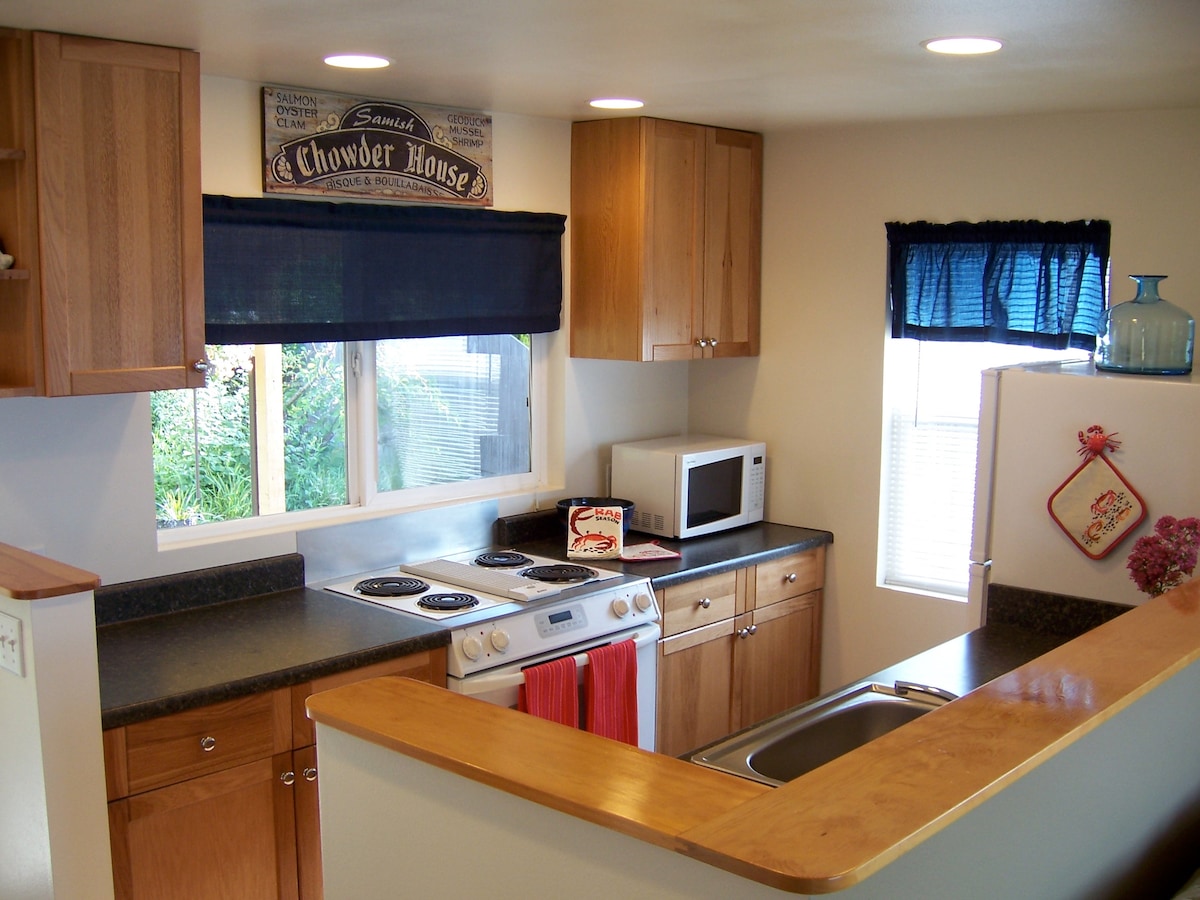 Casa frente al mar. Ala de huéspedes con entrada independiente, baño completo y dormitorio con cama tamaño queen Murphy que se pliega durante el día. Puedes preparar comidas ligeras y la ciudad de Edison, a 6 millas de distancia, tiene excelentes opciones gastronómicas. Trae bicicletas, kayaks y cámaras para explorar. Nuestro gran patio y terraza con fogata, calefacción y parrilla se compartirán de forma segura. Escucharás ruido de la casa principal durante las horas no tranquilas y haré varias tareas y entraré y saldré por el patio.