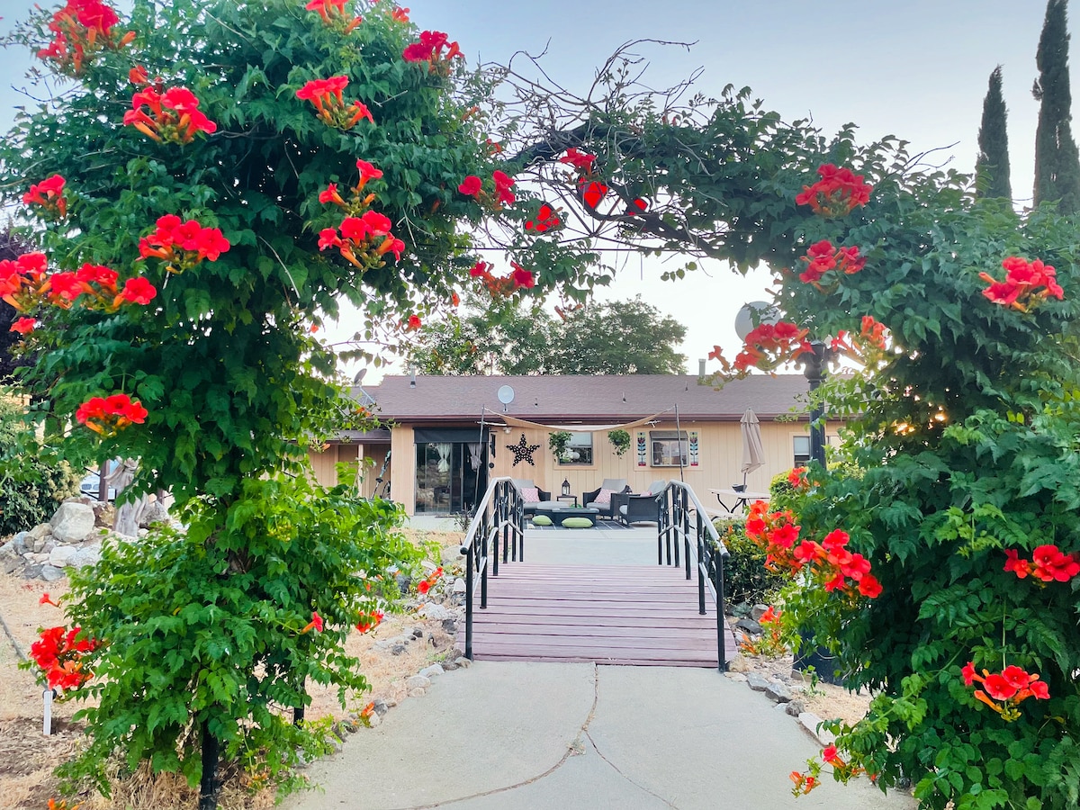 Relájate en la pintoresca campiña de Tehachapi con preciosas vistas y abundante vida silvestre. Trae tus caballos, puestos y senderos disponibles para montar o caminar. Disfruta de espectaculares puestas de sol mientras estás sentado alrededor de un fuego. 3 bodegas, el mundialmente famoso Tehachapi Loop junto con un puente cubierto que te lleva a 2 restaurantes locales cercanos. Relájate en el jardín de cactus con un arroyo en cascada. Duerme profundamente en una cama ajustable tamaño queen Tempur-Pedic y un futón de tamaño completo para huéspedes adicionales.
