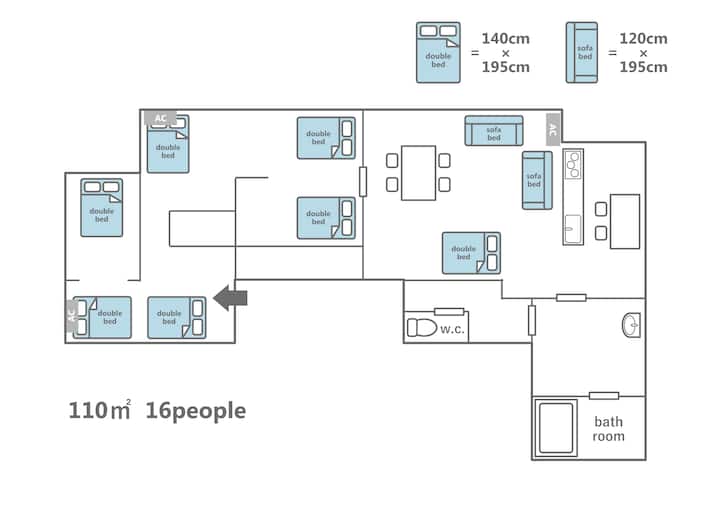 La habitación es para no fumadores y tiene 100 metros cuadrados, con capacidad para 16 personas, con 7 camas dobles de 140 cm × 195 cm y 2 sofás cama individuales de 120 cm × 195 cm. Como norma general, las camas dobles se colocan primero, así que si necesita dormir por separado o necesita ropa de cama especial, póngase en contacto con nosotros antes de su llegada. No se pueden añadir camas supletorias.