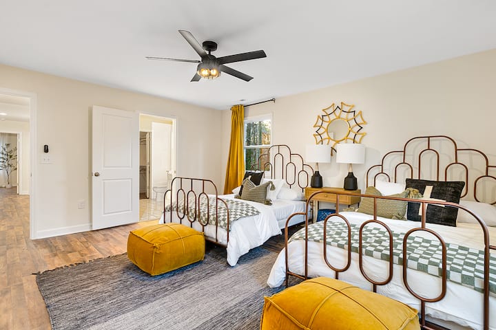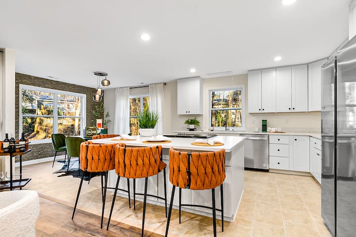 Escápate a nuestro refugio forestal de 7 dormitorios, refugio rústico de Airbnb y apto para mascotas con capacidad para un máximo de 18 huéspedes. Sumérgete en la comodidad, donde cada uno de nuestros espacios cuidadosamente diseñados se adaptan para que tu estancia sea inolvidable. Con salas de estar dobles y DOS cocinas, 7 dormitorios (algunos con baños conectados) y comodidades similares a las de un hotel, tu comodidad está en nuestra mente. Al aire libre, disfruta de un espacioso bosque, un camino bordeado de árboles, terraza, balcón y equipo de pesca.