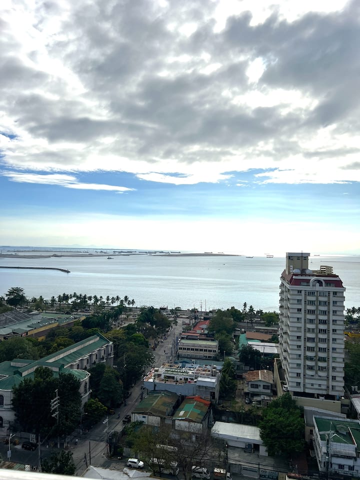 Dormitorio con balcón y vista al mar en Malate Korean Town