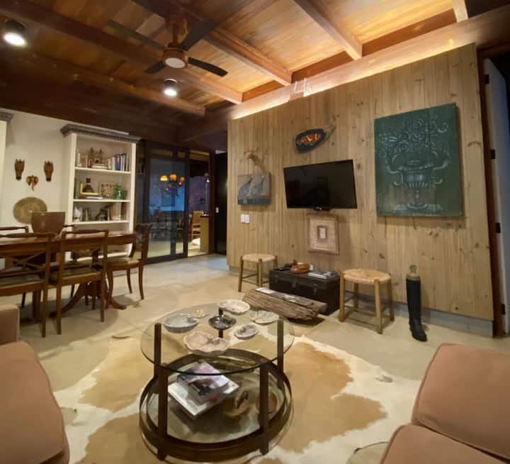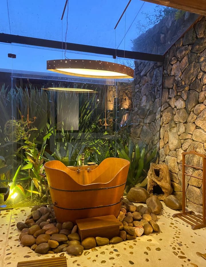 Hay 130 metros cuadrados de área interna y 45 metros cuadrados de terraza cubierta con barbacoa, mesa, entorno con sofá y ducha exterior. En el interior de la casa hay una mesa de comedor y, en el exterior, otra para comidas al aire libre y también una pequeña mesa para un aperitivo o cafetería. Dos suites, duchas con calentador de gas y uno de los baños con un ofurô de madera individual, parte del techo y todo el fondo de vidrio que da a un pequeño jardín.