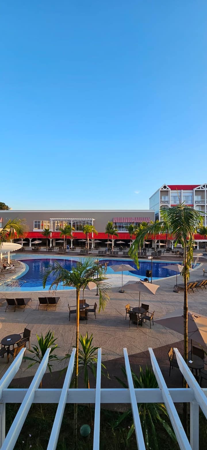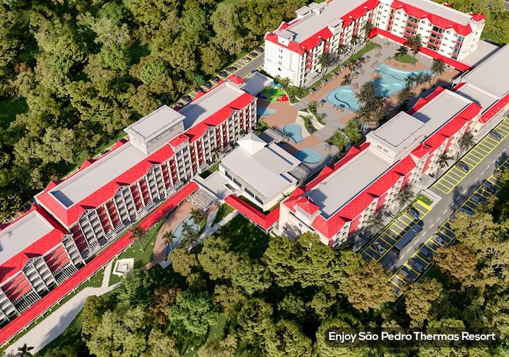 El centro vacacional es grande y muy agradable, con piscinas frías y calientes, sauna, sala de juegos, equipo de recreación, spa con ofurô, sala de masajes, parque infantil, juguete, cine, gimnasio, restaurantes y bares.