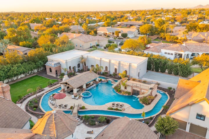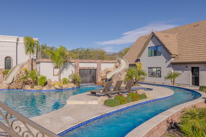 ! Piscina privada estilo resort con jacuzzi, río lento con ramada hundida, chimenea, toboganes de duelo y características acuáticas.