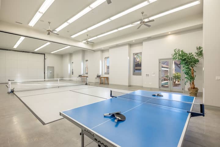 ! Cancha de pickleball cubierta, mesa de ping pong, corn hole, putting greens, misters y audio al aire libre.