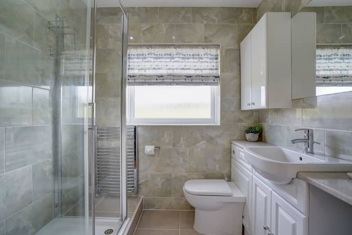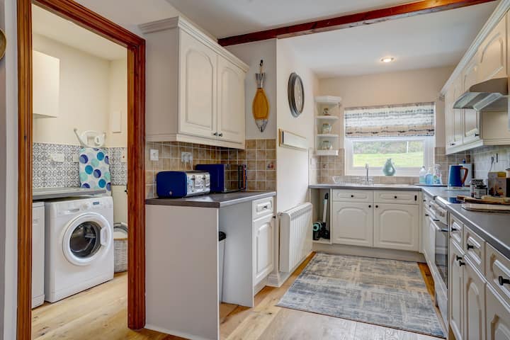 Sala de estar: está en la parte delantera de la casa, más allá del comedor y las escaleras, y ambos se pueden separar por puertas de madera tipo establo. La habitación es luminosa y muy bien decorada. Hay 2 sofás, que ofrecen muchos asientos para 4 personas, una gran mesa de centro, muchos libros y un televisor inteligente Hisense de 43pulgadas con Freeview / Netflix. Las noches de invierno se pueden hacer acogedoras con la estufa de leña.