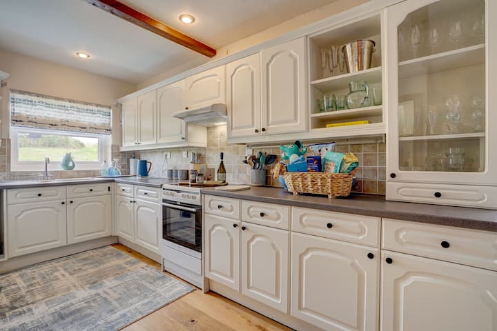 Cocina/comedor: una cocina muy bien equipada con horno eléctrico y vitrocerámica, nevera congeladora y un montón de espacio de almacenamiento en el armario y encimeras. Hervidor de agua, tostadora y microondas. Suelos de madera en todas partes y mucho espacio para los perros. La mesa del comedor tiene 6 asientos fácilmente y las 2 áreas están separadas por una pared de ladrillo. El aparador tiene mucha información sobre la zona, juegos y una sección especial de información y recaudación de fondos para la colonia de focas locales. Hay un lavadero contiguo con lavavajillas y lavadora y mucho espacio en el armario para la comida para perros. Todos los tazones y más se guardan aquí para los perros. Justo de aquí está el ...