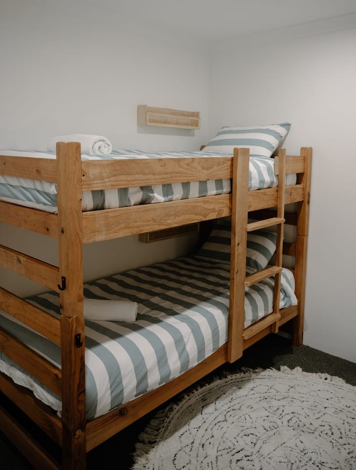 El dormitorio de los niños tiene 1 juego de literas. La ropa de cama se colocará al final de las camas para que los huéspedes puedan hacer las camas en caso de que necesiten usar estas literas. La habitación de los niños tiene una selección de juguetes y libros, cestas de ropa de alambre y un pequeño número de perchas para niños.