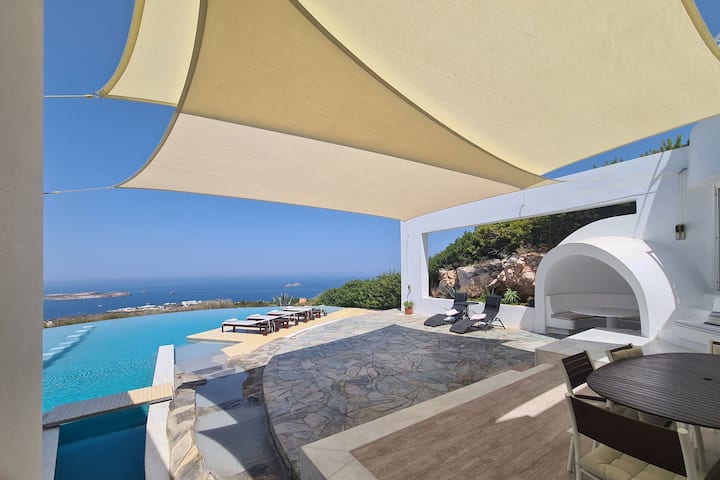 Villa de lujo con piscina infinita y vistas al mar al atardecer