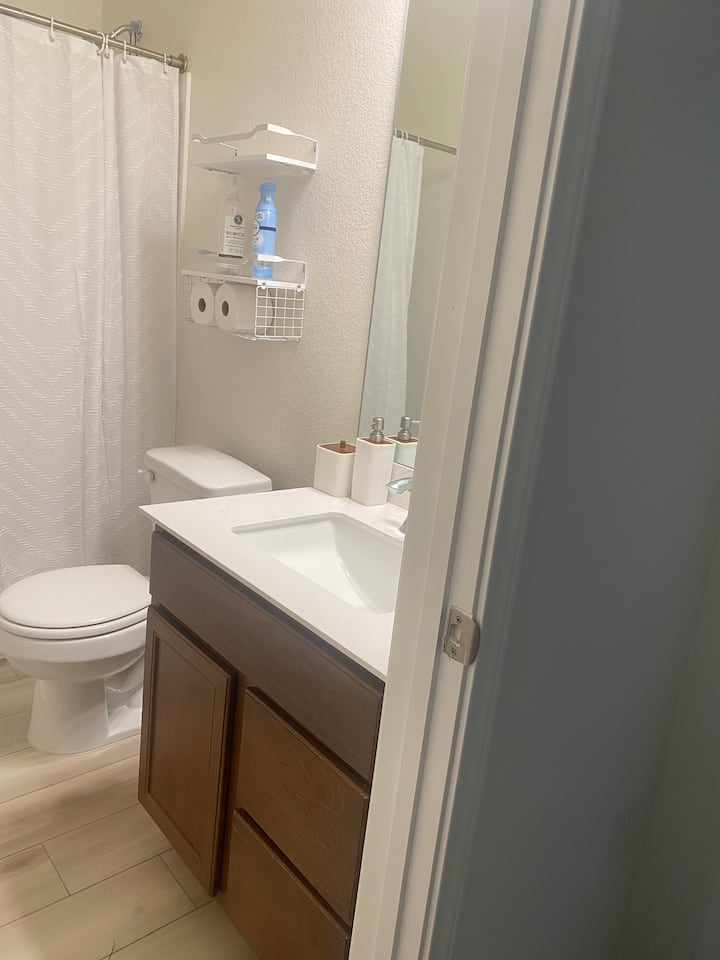 Una habitación y baño dedicado en una casa y zona tranquilas