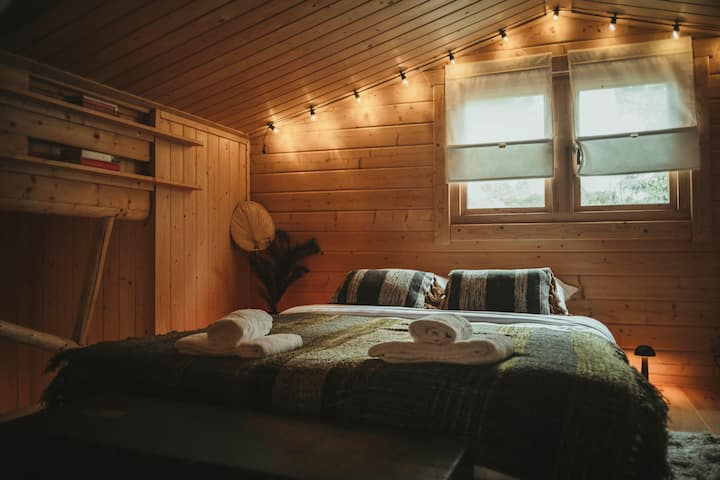 Romántica cabaña de madera con jacuzzi directamente en el bosque