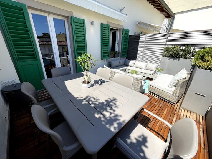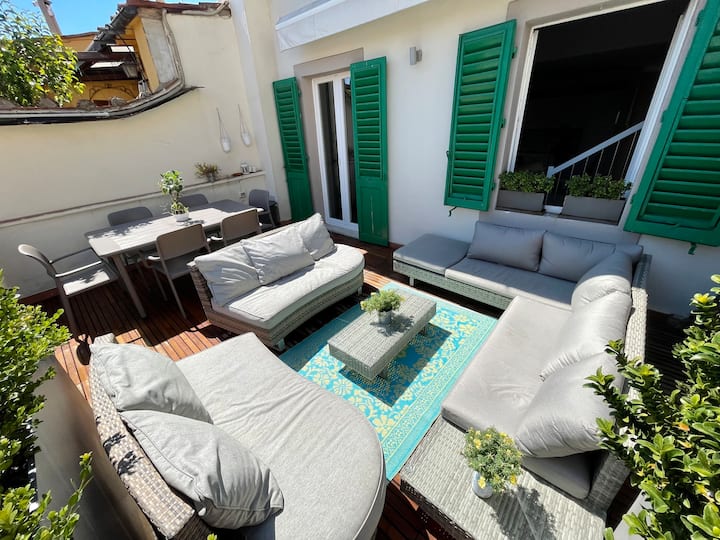 Tiene una gran mesa con capacidad para 6 personas, 4 sofás, plantas y una sombrilla. Es el lugar perfecto para relajarse bajo el sol y tomar el sol en verano. Aquí apreciarás un agradable día libre sentado en la terraza bebiendo un té caliente o disfrutando de una copa de vino contemplando la belleza de Florencia en un día cálido y soleado.