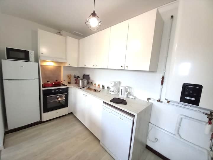 • Cocina abierta: La cocina está equipada para preparar sus comidas y compartir momentos de convivencia. Equipada con lavavajillas, horno, placas de cocción, nevera grande, cafetera de filtro, hervidor de agua y microondas. También tendrá toda la vajilla necesaria para 5 personas.