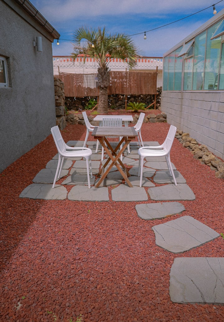 El exterior conserva la apariencia de una casa de piedra tradicional que conserva el viento y los años de Jeju Udo, y el interior ha sido recientemente renovado para ser adecuado para la relajación emocional.