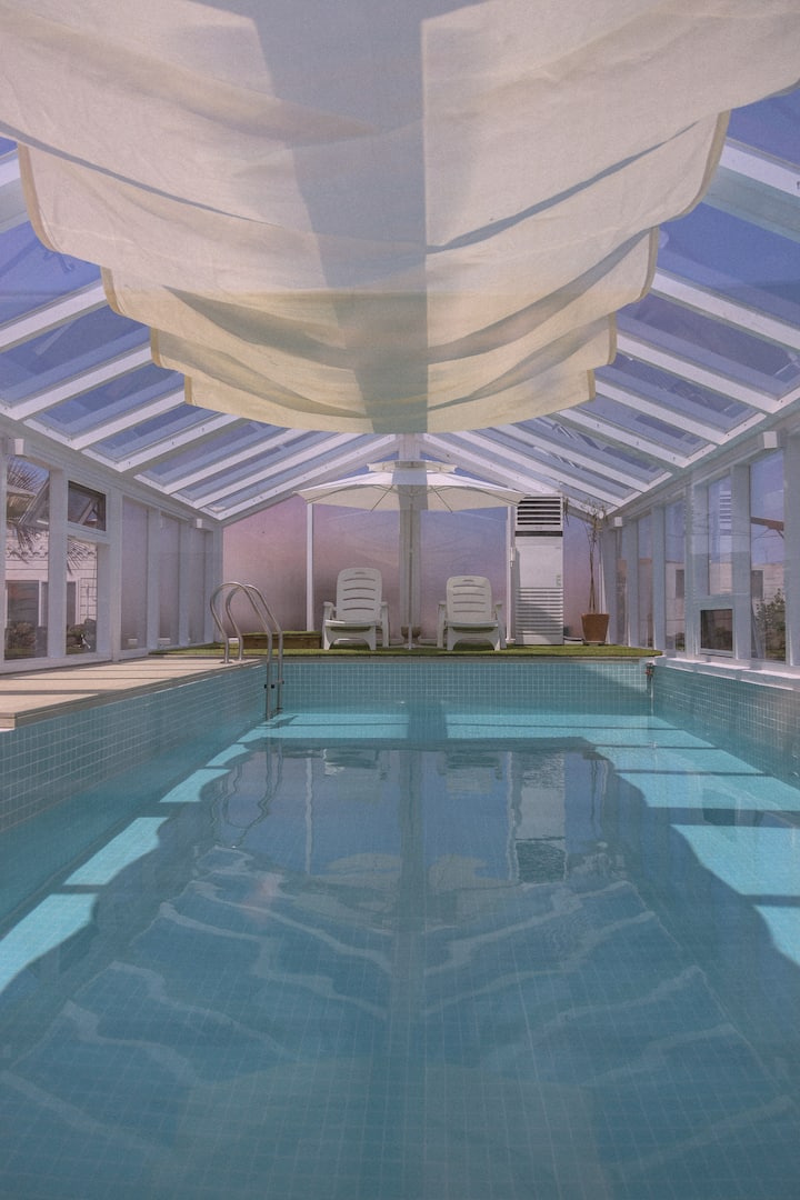 Hay una piscina cubierta de invernadero de vidrio (4 m*8 m) que se puede utilizar independientemente del clima.