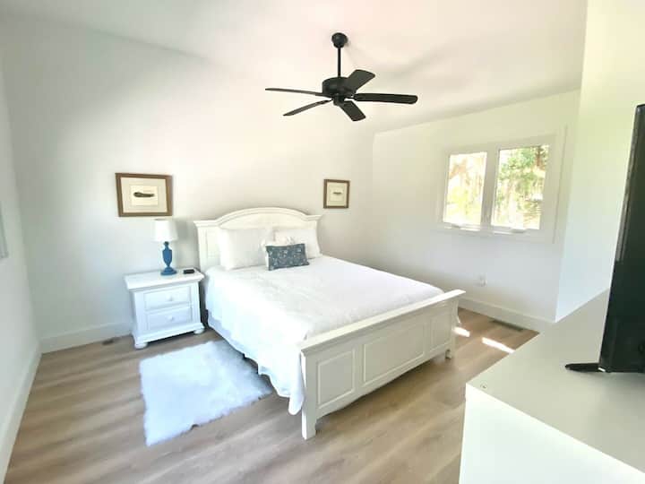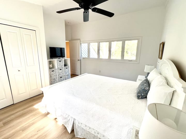 Tranquila casa adosada de dos pisos renovada con vistas al campo de golf. Paseo rápido a pie o en bicicleta a la playa. Esta espaciosa unidad cuenta con una cocina moderna y abierta (recientemente renovada con electrodomésticos de alta gama) y una sala de estar que conduce a una terraza privada que incluye tumbonas y mesa para disfrutar de tu café o cena de la mañana. El espacio habitable incluye un sofá cama tamaño queen y un televisor inteligente de pantalla grande con numerosos servicios de streaming. Hay un medio baño junto al pasillo de entrada. Una lavadora y secadora están convenientemente ubicadas en la unidad para el uso de nuestros huéspedes. Arriba, los huéspedes encontrarán la suite principal con cama tamaño queen, baño moderno completo y techos altos. El dormitorio tiene abundante luz natural y tiene vistas al campo de golf Seabrook Island Club Crooked Oaks.