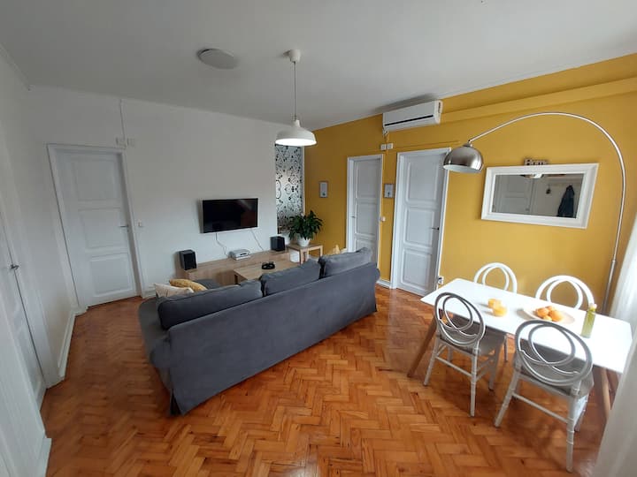 La sala de estar está equipada con aire acondicionado y tiene un cómodo sofá salón con área de estar (chaise longue), TV inteligente LG 4K y sistema estéreo Kenwood. No hay conexión de TV por cable, pero tienes acceso gratuito a las aplicaciones HBO Max, Disney, Prime, UFC y tienes la opción de iniciar sesión en casi cualquier servicio de streaming que puedas imaginar. Los servicios de streaming pueden cambiar con el tiempo. También puedes conectar cualquier dispositivo a través de Wi-Fi con Smart Share en el televisor, para que puedas ver cualquier canal al que tengas acceso. El televisor tiene un cable HDMI adicional conectado para que puedas conectar fácilmente tu computadora. También es posible conectar un disco duro. El estéreo es un set de Kenwood de alta calidad, que puedes conectar a tu dispositivo a través de Bluetooth, USB o un cable de audio normal. La mesa de comedor está al lado de la ventana y hay espacio suficiente para cuatro personas y una silla alta para un bebé.