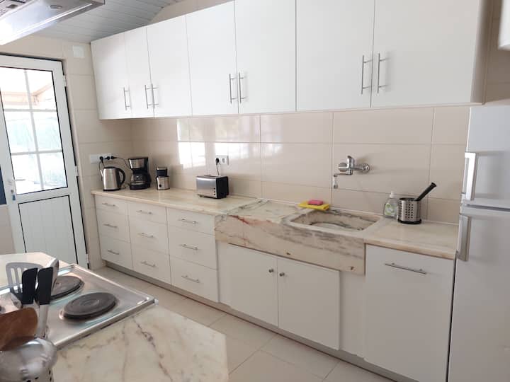La espaciosa y típica cocina portuguesa con una encimera de hermosa piedra natural está totalmente equipada. Hay un refrigerador con un amplio y espacioso compartimento congelador y una estufa eléctrica de 4 quemadores con horno. Además del microondas, también hay una cafetera de filtro, espumador de leche, hervidor, prensa de cítricos, batidora, tostadora, lavavajillas y lavadora. Se han tenido en cuenta todas las necesidades, también se necesitan cubiertos, vajilla y otros equipos más que suficientes. Desde la cocina tienes una vista y acceso al jardín.