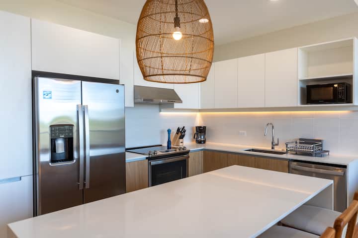 En el interior, descubre un santuario de comodidades contemporáneas. Nuestro apartamento totalmente equipado cuenta con servicios esenciales como lavadora, secadora, lavavajillas y TV, sino también lujos indulgentes que garantizan una estancia inolvidable. Un dormitorio ofrece una cama tamaño king, mientras que el segundo dormitorio ofrece dos camas tamaño queen, con capacidad para grupos o familias de hasta 6 huéspedes.