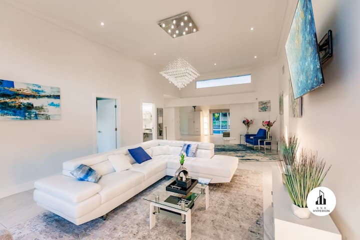 Relájate en esta espaciosa casa de Miami, perfecta para familias o grupos. La propiedad cuenta con cinco habitaciones luminosas, una piscina climatizada, jacuzzi y una cocina moderna totalmente equipada para estancias cómodas. Cada dormitorio incluye camas acogedoras, wifi y televisores inteligentes. El diseño abierto conecta una acogedora sala de estar con una cocina ideal para preparar comidas juntos. Sal a la terraza privada, disfruta de un cómodo estacionamiento y llega al centro comercial Aventura, a las playas cercanas y a los parques en solo unos minutos.