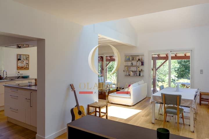 Située dans le petit village basque d’Arbonne, à seulement 7 km de la côte et des plages de Guéthary et Bidart, la maison bénéficie d’un environnement naturel exceptionnel. Son vaste parc de 4500 m², en pente douce jusqu’à la forêt et son ruisseau, offre un cadre de vie magique loin du tumulte estival tout en permettant d’accéder aux plages en seulement 15 minutes en voiture.