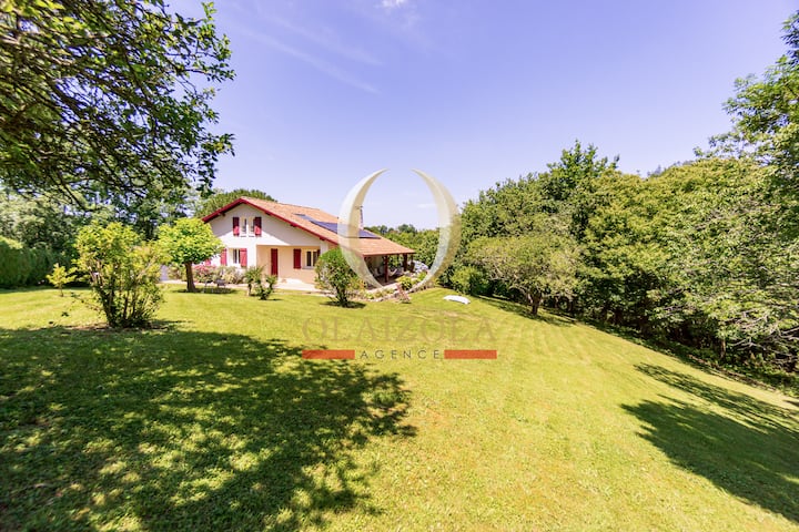 Nichée au bout d’une impasse paisible, cette magnifique villa néo-basque récemment rénovée est une véritable invitation à la sérénité. Entourée de forêt et de champs, elle offre un cadre naturel préservé où le seul bruit qui vous accompagnera sera celui des oiseaux. Idéale pour les amoureux de calme et de nature, tout en restant proche des villes et plages animées de la Côte Basque.