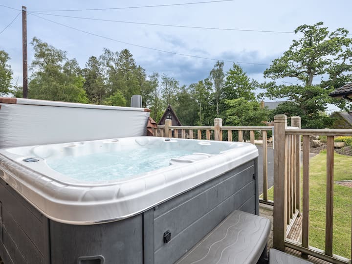 Cabaña con jacuzzi, comedor al aire libre en el parque nacional