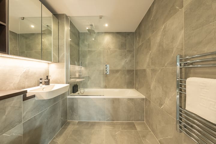 el segundo baño es igualmente impresionante, con una ducha moderna, accesorios de alta calidad y un amplio espacio de almacenamiento. Convenientemente ubicado para servir tanto al segundo como al tercer dormitorio, este baño garantiza que todos los huéspedes tengan acceso a instalaciones de primera categoría.
