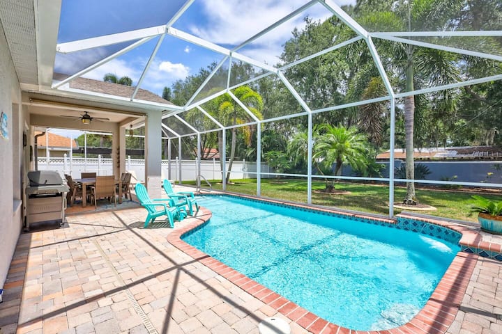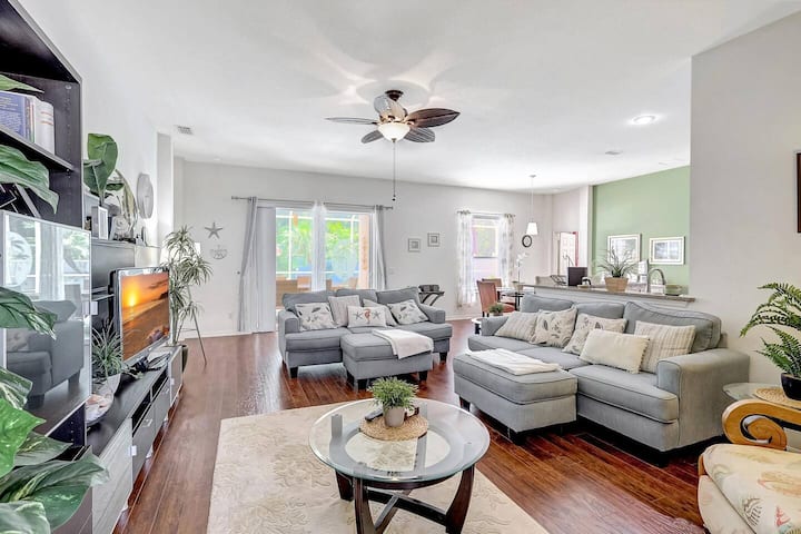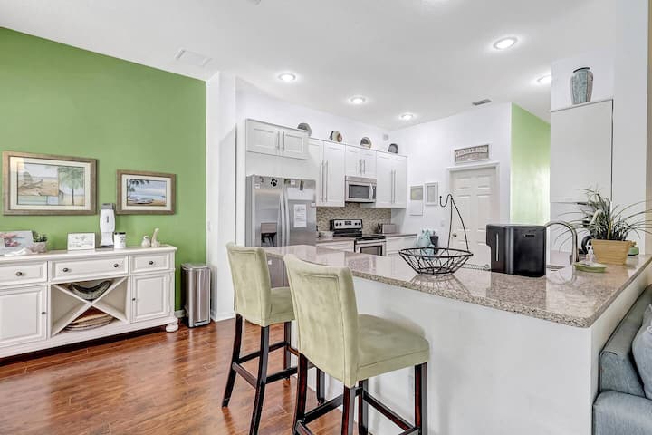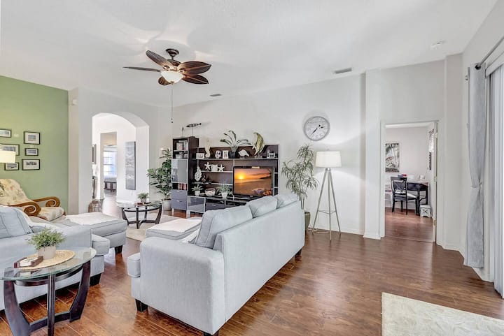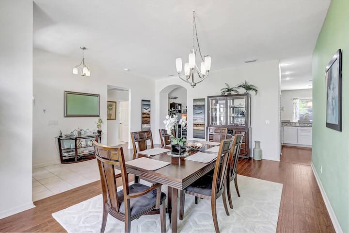 Pero lo más destacado de este alquiler vacacional te espera al aire libre: una piscina resplandeciente con opciones para tenerla climatizada en los meses más fríos. Pasa tus días tomando el sol en sillas cómodas, date un refrescante chapuzón en la piscina para refrescarte o reúnete alrededor del patio junto a la piscina. Con el lanai cubierto incluso puedes disfrutar del exterior durante las típicas duchas de lluvia de verano de Florida por la tarde. La gran barbacoa de 4 quemadores es ideal para que cocines filetes o hamburguesas o tu elección de comida.
