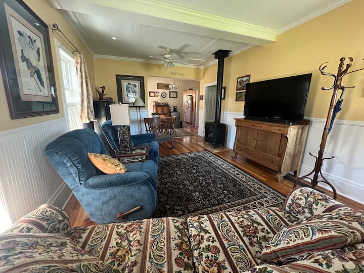 La suite de invitados tiene dos dormitorios privados. El dormitorio delantero tiene una cama tamaño queen y el segundo dormitorio tiene una litera doble, con capacidad para hasta 3 personas en esa habitación. La sala de estar tiene una chimenea de gas, TV inteligente, internet de alta velocidad, asientos cómodos, un majestuoso piano de cola Steinway antiguo que los pianistas experimentados pueden usar, y un pequeño comedor y zona de cocina con microondas, Keurig, mininevera con congelador, dispensador de agua y mesa de comedor. El baño completo tiene una ducha y una bañera con dientes de garras. El porche delantero está disponible para uso privado de los huéspedes, y el cómodo patio también está disponible para su uso durante los meses más cálidos, dependiendo del clima. El patio es de uso compartido con el propietario.