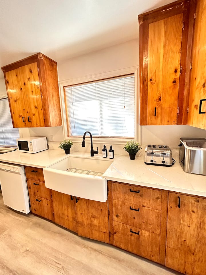 Características: cocina completa, lavadora y secadora, TV inteligente de pantalla de 65 pulgadas con modo de invitado Roku e Internet más rápido de la zona.
