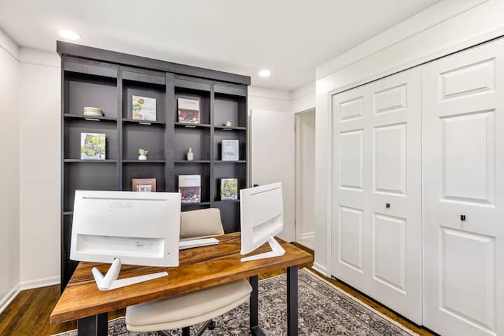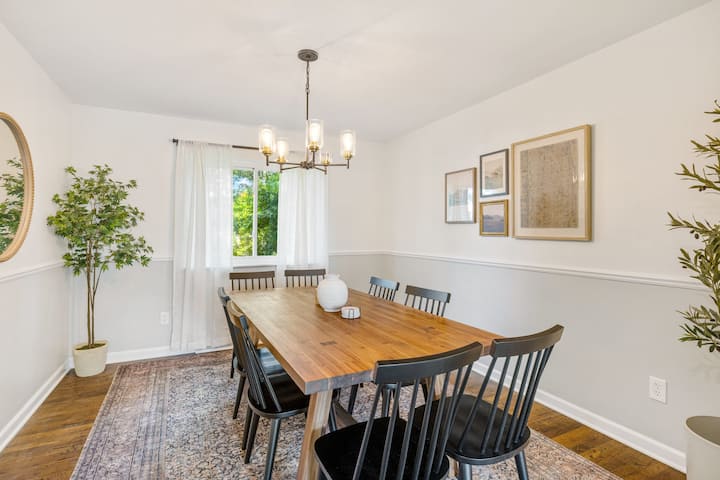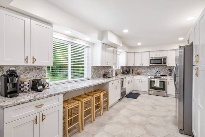 La puerta principal de nuestra casa de 2 pisos con sótano terminado se encuentra a solo unos pasos. La planta baja tiene un medio baño junto con la cocina, la sala de estar, el comedor y una oficina/ dormitorio con una cama plegable. El segundo piso cuenta con cuatro (4) habitaciones, una de las cuales es una suite principal que incluye un baño. También hay un segundo baño completo en la planta superior con tocador doble y bañera. El sótano terminado tiene un dormitorio, un baño completo, nuestras lavadoras y una acogedora y espaciosa zona de entretenimiento con un gran televisor y un cómodo sofá.