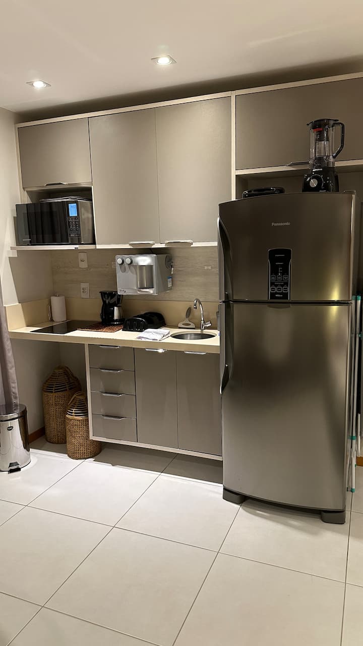 El loft, decorado con estilo, tiene un concepto abierto con un divisor de madera que separa el dormitorio de la sala y la cocina. Tiene 2 televisores, uno en el dormitorio y otro en la sala. Con una cómoda cama doble, ventanas que dejan entrar luz natural, una cocina integrada con la sala de estar y un amplio balcón en forma de L con una vista surrealista de la Playa de Icaraí. Totalmente equipado, está a 200m de la playa, cerca de farmacias, mercado, restaurantes y la calle famosa de Icaraí.