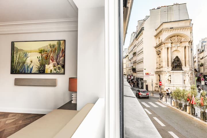 Viva una experiencia única en un apartamento típico del París pre-Haussmanniano, vecino inmediato de aquel en el que vivió el famoso comediante y dramaturgo Molière, cuyo monumento conmemorativo se puede ver desde la ventana («La Fontaine Molière»). Cargado de historia, el edificio fue en 1658 la casa de los hermanos Gaspard y Balthazar Marsy, escultores de renombre a los que debemos varias obras importantes del Palacio de Versalles y del Louvre. Con su configuración en forma de U orientada hacia las galerías del Palais-Royal, que antiguamente estaban al aire libre, el apartamento es probablemente lo que más se acerca a la última vivienda de Molière según los testimonios históricos.