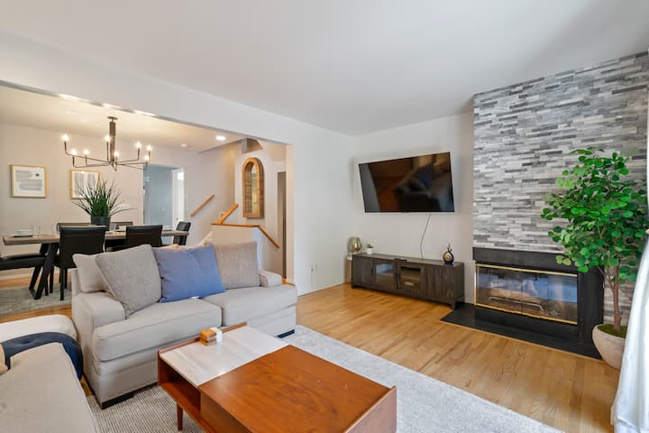 Al subir al segundo piso, te recibirá nuestra cálida y acogedora sala de estar a tu izquierda. Dos sofás muy cómodos están perfectamente dispuestos frente a un gran televisor inteligente TCL Roku de 65pulgadas, lo que garantiza un momento fantástico ya sea que te relajes en el sofá o veas tus programas favoritos.