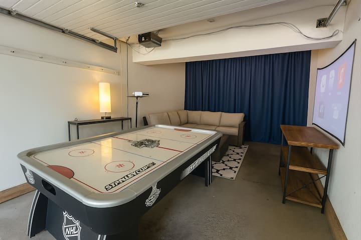 Garaje: ¡Entra en tu propio salón de juegos privado! El garaje se ha transformado en el mejor lugar de reunión, equipado con todo lo necesario para una noche de diversión. Relájate en el sofá y enciende una película en la gran pantalla del proyector, o desafía a tus amigos a un rápido enfrentamiento de hockey aéreo. Si los dardos son más de tu estilo, apunta al tablero de dardos, o sal de la caja con una ronda de cornhole. Ya sea que estés buscando una noche de cine acogedora, una competencia amistosa o simplemente un lugar para relajarte, este espacio tiene todo lo que necesitas.