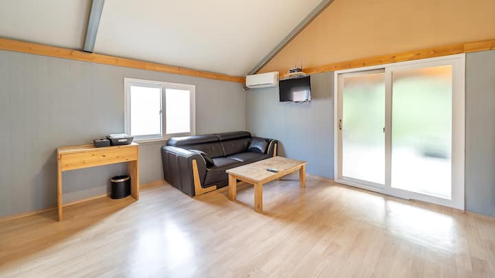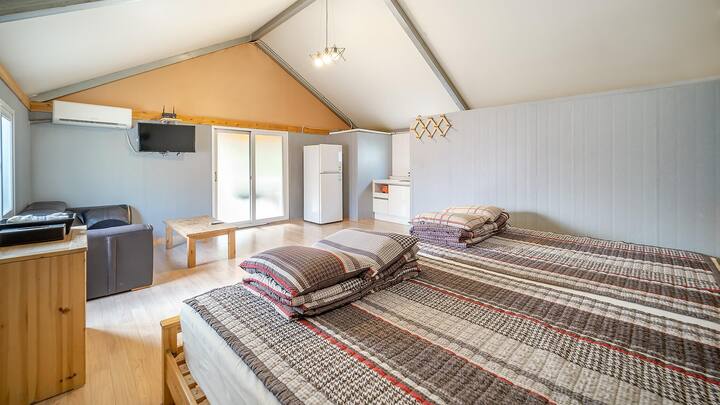 TV, barbacoa individual, nevera, utensilios de cocina, cafetera, olla arrocera eléctrica, microondas, Wi-Fi, aire acondicionado, terraza, secadora, tocador, dormitorio, cama doble, VOD, artículos de baño, glamping
