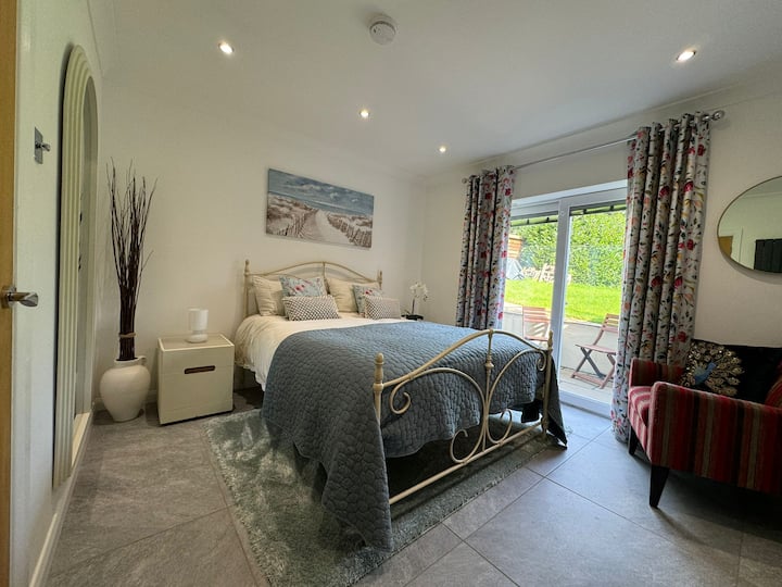 El acceso a The Welsh Retreat es a través de la entrada de los huéspedes, caminando a través de la puerta de 5 bares hacia el jardín trasero de la propiedad, por un camino pavimentado y suavemente inclinado (con 2 escalones hacia la parte inferior) hacia la terraza de entrada pavimentada.