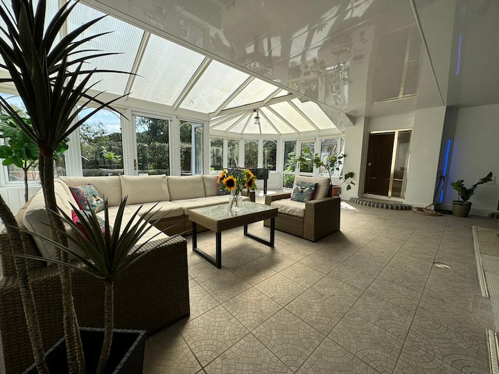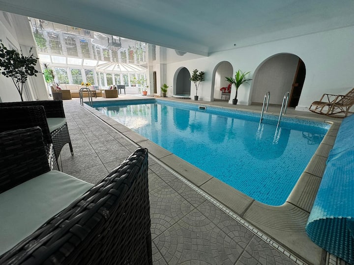 Suite de lujo, espaciosa (más de 3000 pies cuadrados) en la planta baja con entrada privada, piscina cubierta, jacuzzi, mesa de billar, bar y varias terrazas para tu uso exclusivo. Totalmente equipado y amueblado a un alto nivel, incluyendo ropa de cama de calidad y wifi gratuito de alta velocidad. Separada de la casa principal, la suite de huéspedes consta de toda la planta baja, con entrada de huéspedes separada y privada, situada en aproximadamente 1 acre de jardines, con arroyo fronterizo. Zonas de jardín con césped ocasionalmente compartidas con los anfitriones/casa principal.