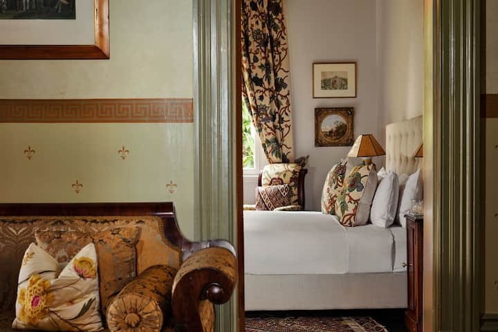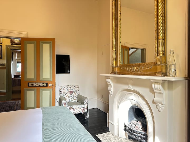Entrarás por los terrenos históricos de la propiedad de Corinda, rodeados de jardines cuidados y arquitectura patrimonial. La entrada de la habitación ofrece encanto y comodidad, lo que te permite ir y venir libremente durante tu estancia.