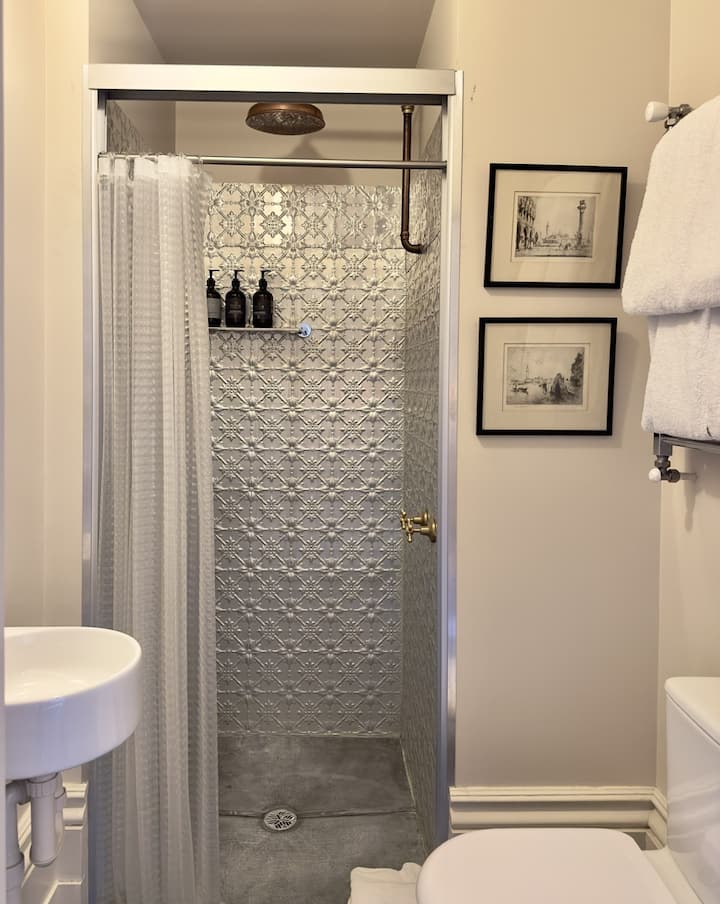 Disfruta de interiores bellamente restaurados con elegantes detalles de época y un ambiente tranquilo y atemporal. La habitación está totalmente climatizada para mayor comodidad durante todo el año e incluye un espacio de trabajo dedicado con un escritorio y un punto de alimentación para los huéspedes que necesitan trabajar o estudiar.