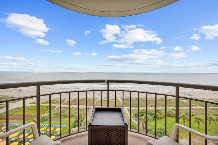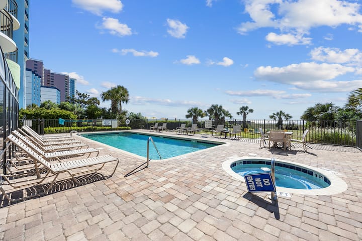Sal al balcón directo con vista al mar para disfrutar del amanecer junto con tu taza de café por la mañana. Este alquiler en Myrtle Beach tiene una piscina frente al mar, piscina cubierta y jacuzzis para elegir, así como una sala de estar frente al mar para tomar el sol. Con una ubicación céntrica, ¡caminar hasta el paseo marítimo es muy fácil! ¡Este espacio es ideal para aquellos que aman los olores y sonidos del mar, así como la proximidad a toda clase de actividades!