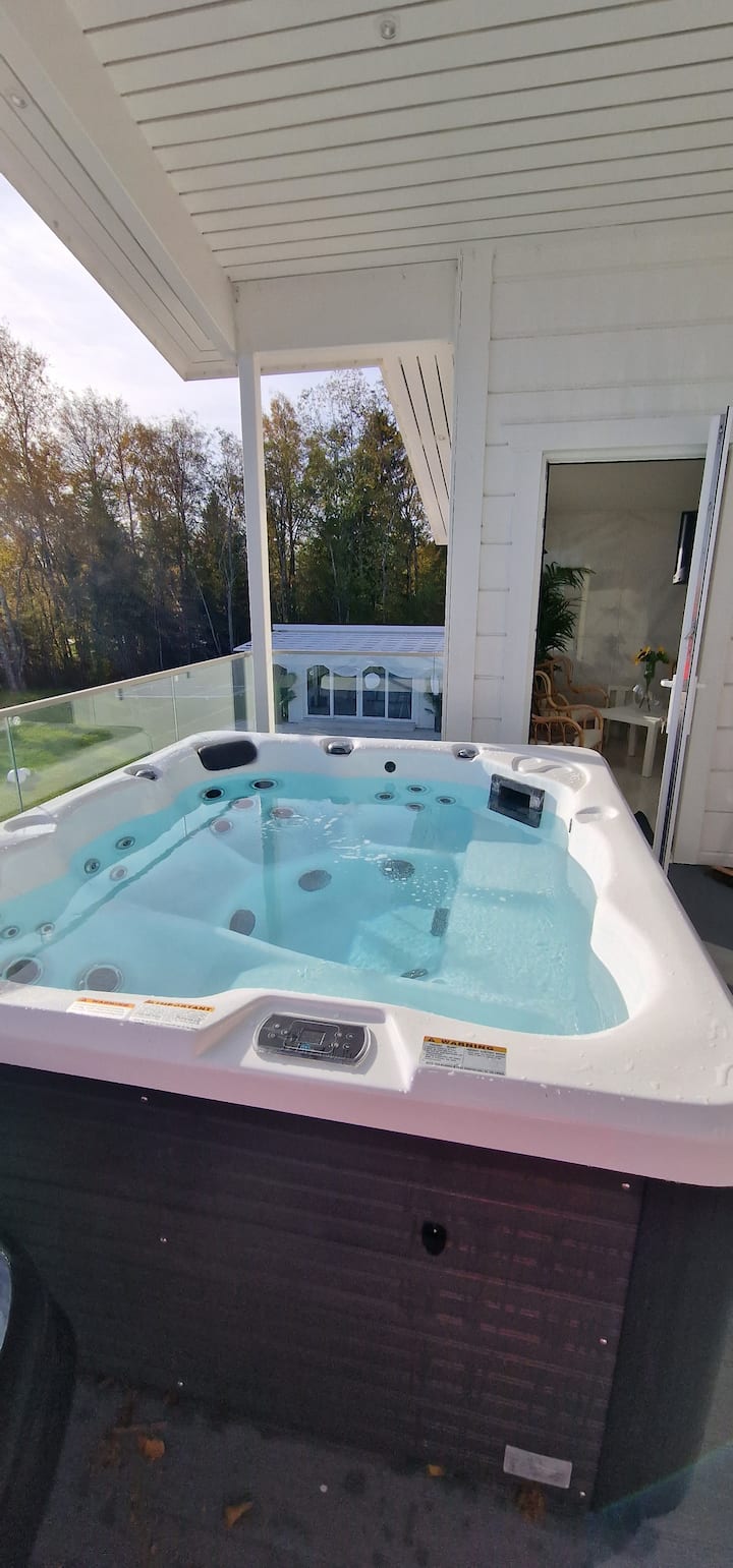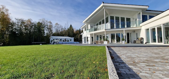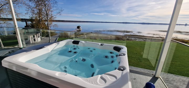 casa única en la orilla del agua con piscina y sauna