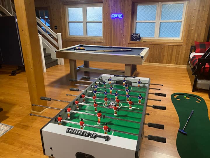 🎮 ¡Tiempo de juego! Dirígete a la sala de juegos del sótano para disfrutar de una diversión épica: con una mesa de billar🎱 🏓, ping pong⚽, futbolín🕹️, juegos de arcade retro y juegos de mesa 🎲.
