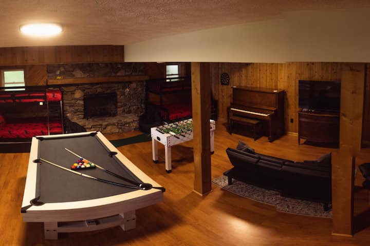 1 dormitorio está en el sótano. Es de techo alto y tiene capacidad para 6-8 personas. También hay mucho espacio con sofá, mesa de billar y otros juegos. Así que no está apretado en absoluto.