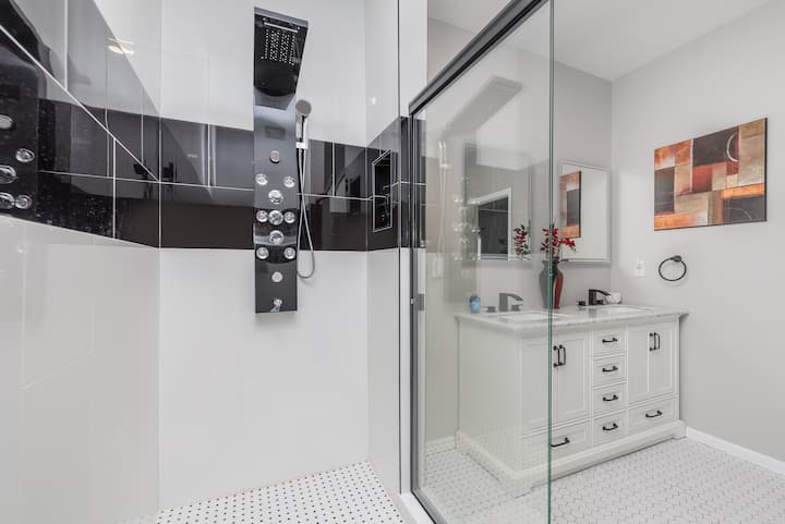 Lujosa suite principal: relájate en una cama tamaño king, disfruta de un televisor inteligente de 42pulgadas y refréscate en el baño principal tipo spa con una ducha de efecto lluvia de 8 pies con dos cabezas y chorros corporales relajantes.
