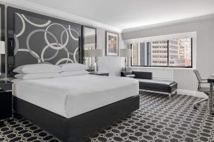 Disfrute de una vida urbana de primer nivel en la habitación Executive King con balcón, un refinado refugio en Midtown con un diseño atrevido, una lujosa cama tamaño king y su propio espacio privado al aire libre. Con hasta 385 pies cuadrados de espacio cuidadosamente diseñado, es ideal para viajes de trabajo, aniversarios o estancias individuales con vistas panorámicas.