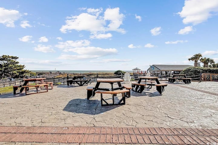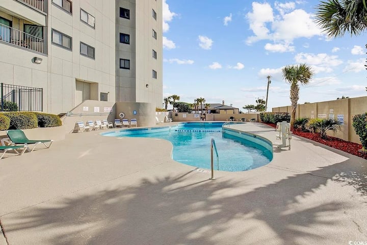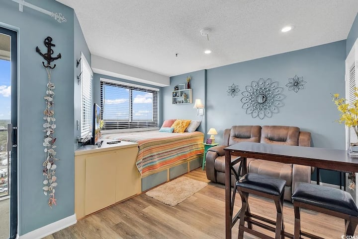 El condominio de eficiencia en el décimo piso bellamente amueblado y decorado con vistas al mar cuenta con pintura nueva, pisos, ducha/bañera e inodoro actualizados. La cocina está equipada con todos los electrodomésticos que se abren al resto de la unidad. Una cama tamaño queen con vista panorámica al mar, una cama Murphy para mayor espacio para dormir. Este tranquilo centro vacacional cuenta con una comunidad cerrada frente al mar de 33 acres con muchas comodidades, como piscina al aire libre, río lento, tenis, canchas de baloncesto, spa frente al mar, etc.